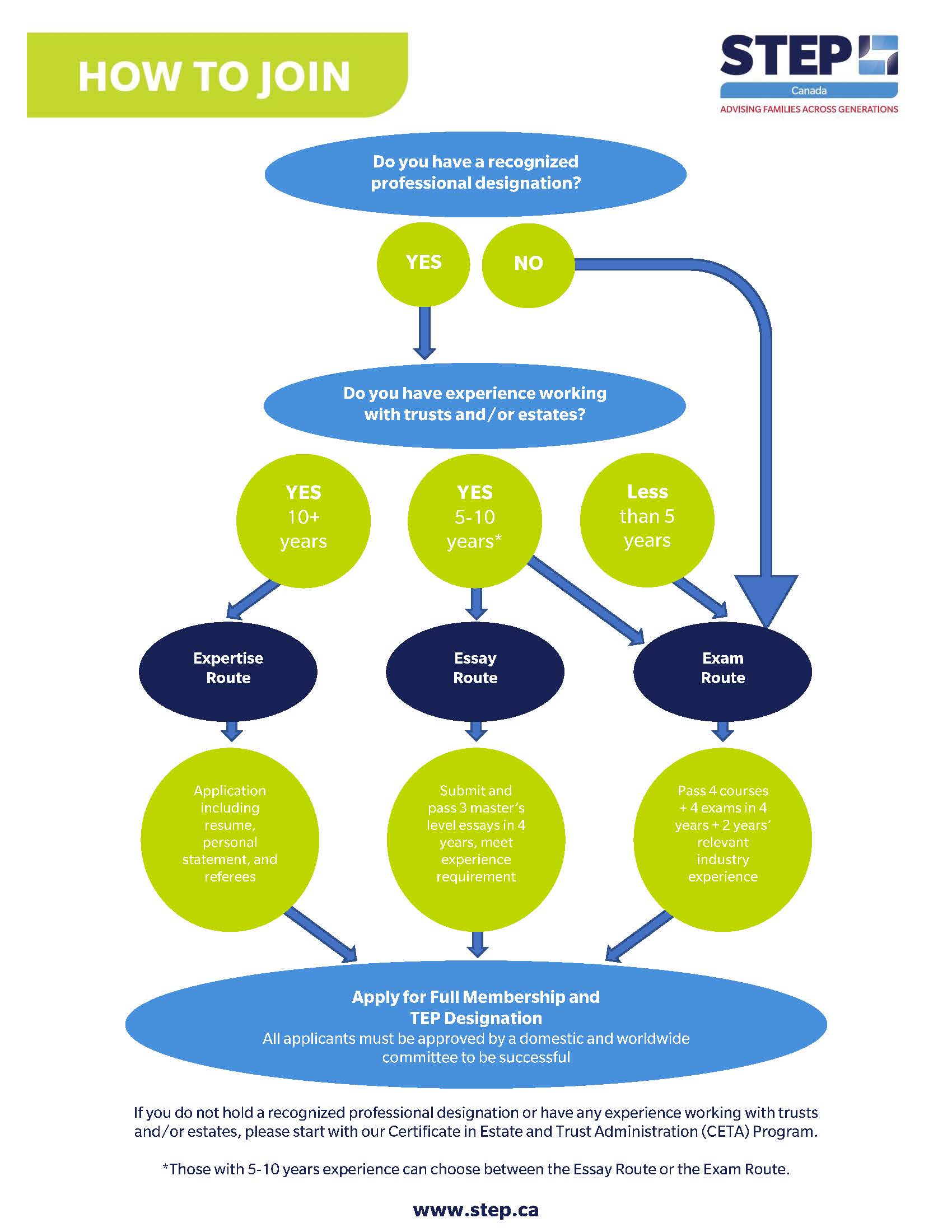 This application-based route to membership is reserved for the most senior trust and estate practitioners in Canada. Candidates must have a minimum of ten years appropriate and relevant experience in the area of trusts and/or estates and hold a recognized professional designation in good standing. The experience of all potential candidates is compared and examined against the relevant sections of the STEP Canada Diploma in Trusts and Estates. A thorough application including a detailed resume, four referee evaluation statements, and a self-authored personal statement are required for this route. Applications are subject to approval by STEP Canada and STEP Worldwide. Successful applicants are granted the TEP designation and full TEP membership.